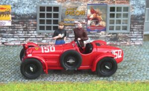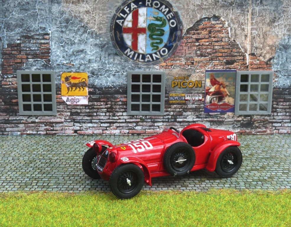 Ein Fertigmodell von „AlfaModel43“ ist heute noch lieferbar, aber ebenfalls recht teuer. Es ist rot lackiert, hat schöne Speichenräder, aber die Form der Dachpartie und der Seitenfenster ist nicht überzeugend. Außerdem hat das Modell abgedeckte Hinterräder (Spats) und ein kleines Kennzeichenschild vorn: Das war der Status des Fahrzeugs vor Beginn des Rennens (bei der technischen Abnahme).